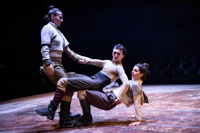 Die Bühne wird zum Experimentierfeld, auf dem die Tänzer Anna Kempin, Marcella Centenero und Daniel Conant die Schwerkraft herausfordern und ihr zugleich unterliegen. Mit den schweren, sandgefüllten Säcken, die die Tänzer